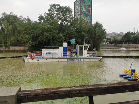 公司研發(fā)的加壓控藻船,以玻璃鋼船體為平臺,配置藍(lán)藻打撈、壓力控藻和曝氣裝置...